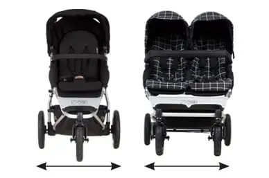 the front wheels can be locked back OR full swivel for added manoeuvrability and control when pushing on rough terrain or jogging