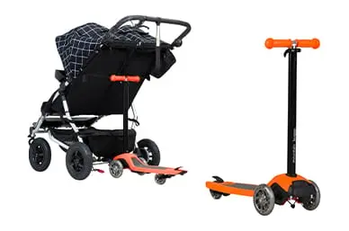 With the Mountain Buggy® strength and engineering, you can attach the freerider™ scooter board to duet™ for a fun day out.
